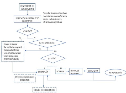 Si no hay ninguna situación que pudiera impedir la dispensación, se procederá de un modo u otro si es la primera vez que se va a utilizar el medicamento que no precisa prescripción o producto sanitario (tratamiento de inicio) o si no lo es (tratamiento de continuación).