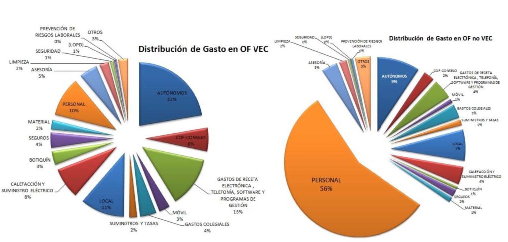 Según los datos recabados, la cantidad mensual en gastos fijos de una farmacia VEC es de 1.231 euros, mientras que una farmacia no VEC gasta 4.431 euros mensuales. Esta amplia diferencia se debe sobre todo a los gastos en personal (que suponen el 56% de los gastos no fijos en una farmacia no VEC). Así, si se extrae la cantidad destinada a nóminas, las farmacias VEC tienen un gasto mensual de 1.107 euros y el resto de 1.946 euros.