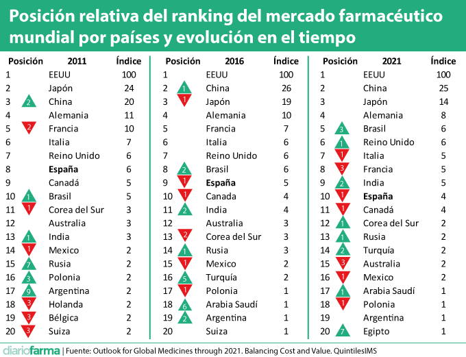 Destaca también, en lo que tiene que ver con España, la pérdida de posiciones en el ránking mundial por gasto en medicamentos, en el que todo parece indicar, según QuintilesIMS, que pasará del puesto octavo, que ocupaba en 2011, al noveno en 2016, año en el que será superado por Brasil. En 2021 también será alcanzado, previsiblemente, por India, cayendo al décimo lugar. Otros países como Italia o Francia, con políticas de contención, también perderán posiciones en ese ránking, que incluirá en su top 10, por primera vez, a tres países emergentes: China (2º por detrás de Estados Unidos), Brasil (5º) e India (9º).