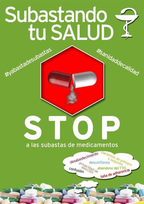 Los farmacéuticos han diseñado un cartel para exhibir en sus farmacias, en el que denuncian que están 'Subastando tu salud' y cuentan con material para explicar a los pacientes los problemas que ocasionan las subastas, en especial, los desabastecimientos frecuentes que se producen. De este modo, esperan emular la reciente victoria que el médico Spiriman logró en su lucha contra la fusión de hospitales en Granada y Huelva y que la Junta de Andalucía se ha visto obligada a dar marcha atrás.
