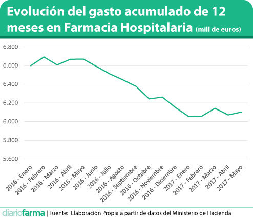 Más allá de estos datos, la evolución general del gasto farmacéutico hospitalario se mantiene en una senda negativa. En los primeros cinco meses de 2017 se invirtieron un total de 2.520 millones, un 1,9% menos que los 2.569 millones de mayo de 2016.