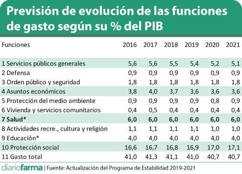 Aunque la cifra aportada por el Gobierno dista mucho de las promesas realizadas en campaña electoral por parte del PSOE y, además, podrán ser incrementadas ante una modificación del sistema de financiación autonómica, en comparación con el Programa de Estabilidad 2018-2021 que presentó el Partido Popular el pasado ejercicio, sí que se observa un incremento de la inversión estimada en salud. El PP había estimado una reducción paulatina hasta el 5,59% en 2021, si bien es cierto que la realidad siempre estuvo por encima de las previsiones realizadas año a año por Cristóbal Montoro. A modo de ejemplo: en 2014 se previa que el gasto público en salud de 2017 estuviera en el 5,3% del PIB, pero finalmente cerró en el 6,26%.