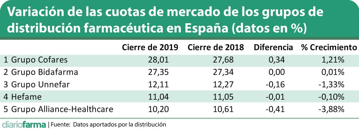 Cofares ha integrado además este año a Cofarta, con lo que sumaría ya el 28,01% del mercado. Cabe destacar, además, su vínculo estrecho con el Grupo Centro Farmacéutico SL, que aglutinó el 1,96%, traes caer ligeramente desde el 2,01% que registró en 2018.