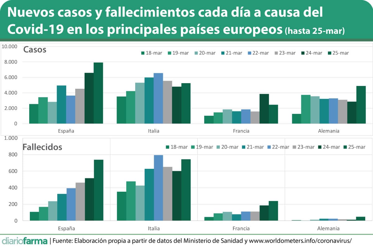 En este martes, nuestro país se aproximó al máximo número de fallecimientos en un día registrado en Italia, que se encuentra en 793, el pasado domingo e iguala a los registrados en este país este mismo martes 24 de marzo, 743.