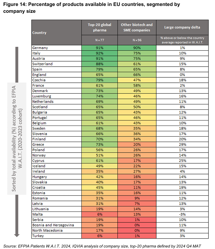 Basándose en datos extraídos del informe WAIT, el trabajo de la Efpia sobre las causas profundas de la diferencia en el acceso asegura que “la evidencia demuestra sistemáticamente que la EMA es más lenta que la FDA” y ello lo ejemplifica con los medicamentos oncológicos: "Un estudio de 2025 revisó 152 nuevas terapias oncológicas aprobadas tanto por la FDA como por la EMA entre enero de 2003 y diciembre de 2024 y descubrió que el 94 % fueron aprobadas por la FDA antes que por la EMA”.