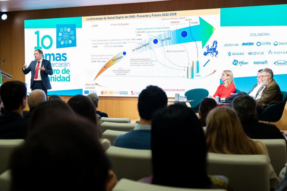 El secretario general destacó la magnitud del despliegue presupuestario: más de 1.126 millones de euros distribuidos en seis planes y 737 proyectos activos en todo el país. En ese marco se sitúan el Programa de Servicios Digitales e Interoperabilidad del SNS y el Plan de Sostenibilidad, con 400 millones de euros ya licitados en un 98%, junto al Plan de Transformación Digital de la Atención Primaria, que avanza en fases muy avanzadas de ejecución. En paralelo, se está construyendo el Espacio Nacional de Datos de Salud, piedra angular para el uso secundario de la información sanitaria, y se ha lanzado el proyecto SiGenES, dedicado a la normalización genómica como base para el intercambio y explotación de datos de secuenciación en todo el territorio.