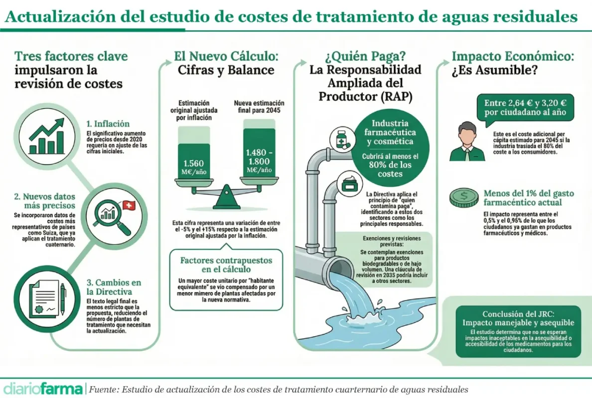 El Ejecutivo comunitario justificó su decisión en los resultados de un nuevo estudio sobre los costes y las repercusiones de la Responsabilidad Ampliada del Productor (RAP), que estimó un impacto económico de entre 1.480 y 1.800 millones de euros. Estas cifras se situaron en niveles similares a los recogidos en la Evaluación de Impacto de la Comisión publicada en 2022, que cuantificó los costes en torno a 1.200 millones de euros. Esto supondría un impacto por ciudadano de entre 2,64 y 3,20 euros, algo menos del 1% del gasto farmacéutico. Este impacto, tal y como temen los países, de acuerdo a lo que expresaron en el último Consejo de Empleo, Política Social, Sanidad y Consumidores (Epsco), será imputado al coste de los nuevos medicamentos dado que en los antiguos es mucho más complejo de incrementar sus precios. La Comisión considera que tendría un impacto mínimo en la sostenibilidad del sector farmacéutico y que sus efectos sobre el acceso y el precio de los medicamentos serían marginales.