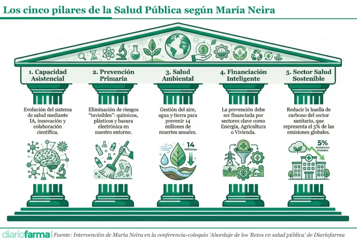 Estas conclusiones se expusieron en un coloquio celebrado en Madrid que reunió a María Neira, directora del Departamento de Salud Pública y del Ambiente de la Organización Mundial de la Salud; Javier Padilla, secretario de Estado de Sanidad, que sustituyó a la ministra de Sanidad, Mónica García, cuya participación estaba confirmada, y Alberto Martínez, consejero de Salud del País Vasco, quienes abordaron los retos de la salud pública desde los planos global, estatal y autonómico. El debate estuvo moderado por José María López Alemany, director de Diariofarma y permitió contrastar enfoques institucionales complementarios sobre preparación, prevención y sostenibilidad de los sistemas de salud desde los ámbitos global, nacional y autonómico.