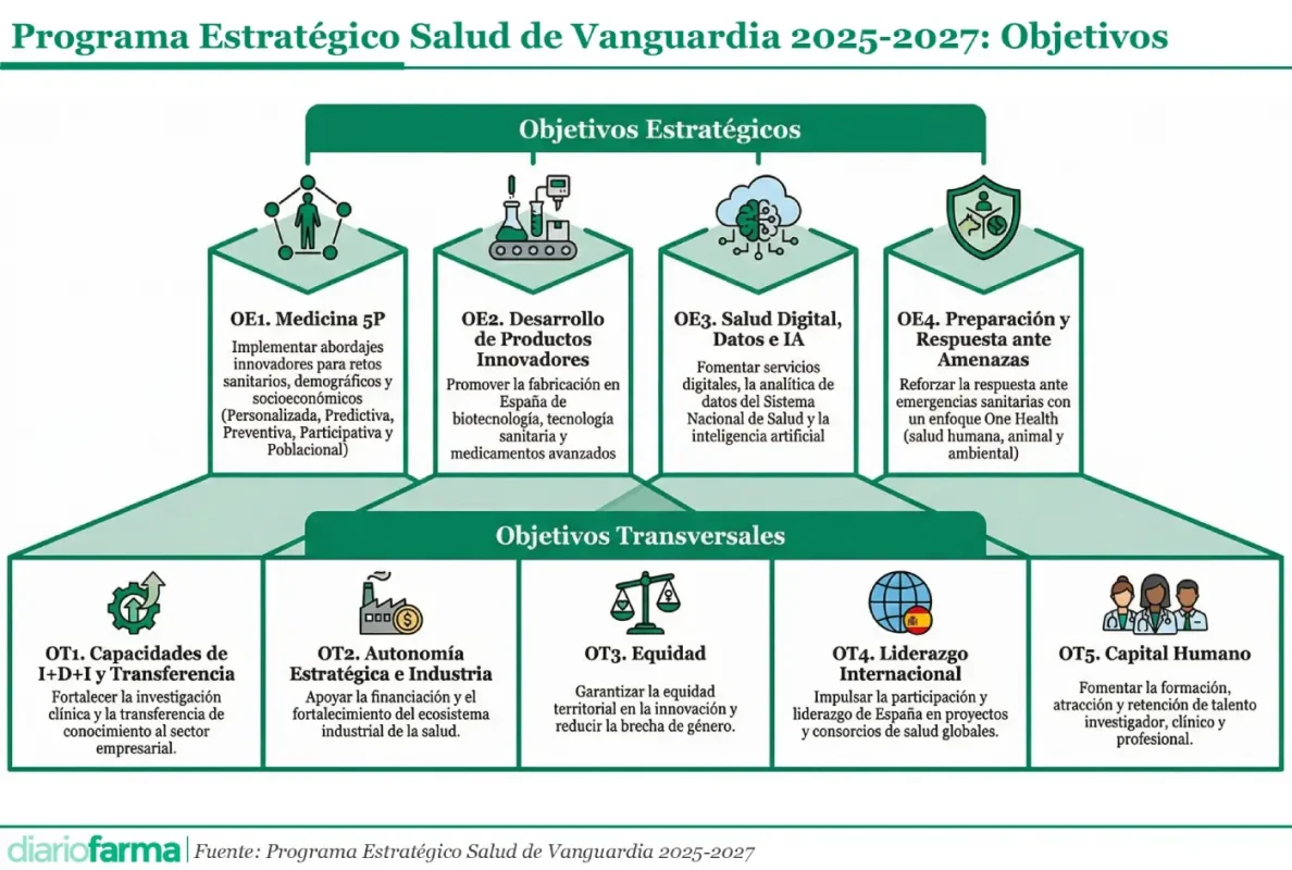 Sobre esta base, el Programa Estratégico identifica una serie de objetivos estratégicos que estructuran su despliegue y que abarcan desde la evolución hacia modelos avanzados de atención sanitaria hasta el refuerzo de la fabricación de medicamentos y tecnologías críticas. Estos objetivos se conciben de forma interrelacionada, de modo que los avances en medicina personalizada, digitalización o preparación frente a amenazas globales se apoyen en una base sólida de capacidades industriales, científicas y tecnológicas.