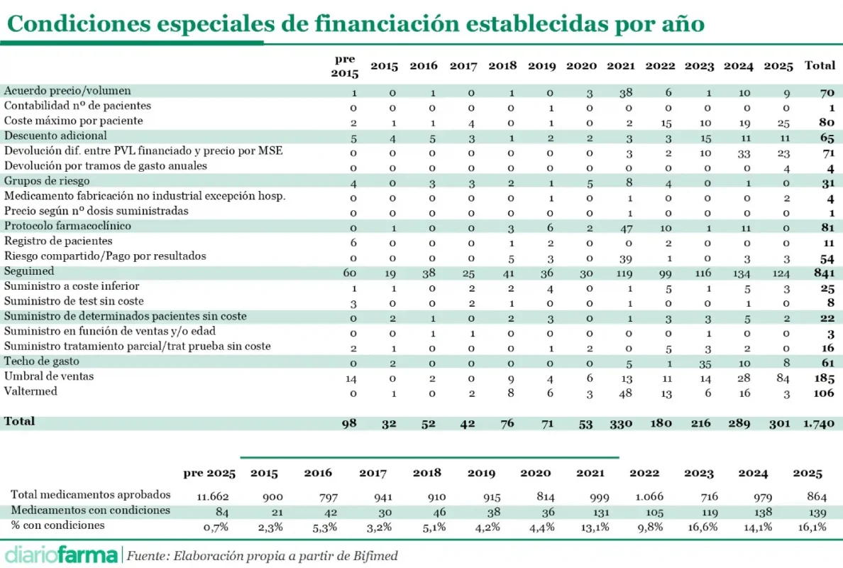 También descendió la utilización de Valtermed como elemento asociado a las condiciones de financiación. Aunque el sistema continúa operativo, su menor presencia en los acuerdos más recientes apunta a una pérdida de protagonismo. No obstante, este comportamiento podría estar condicionado por el perfil de los medicamentos financiados en el periodo analizado, sin que los datos permitan establecer conclusiones causales.
