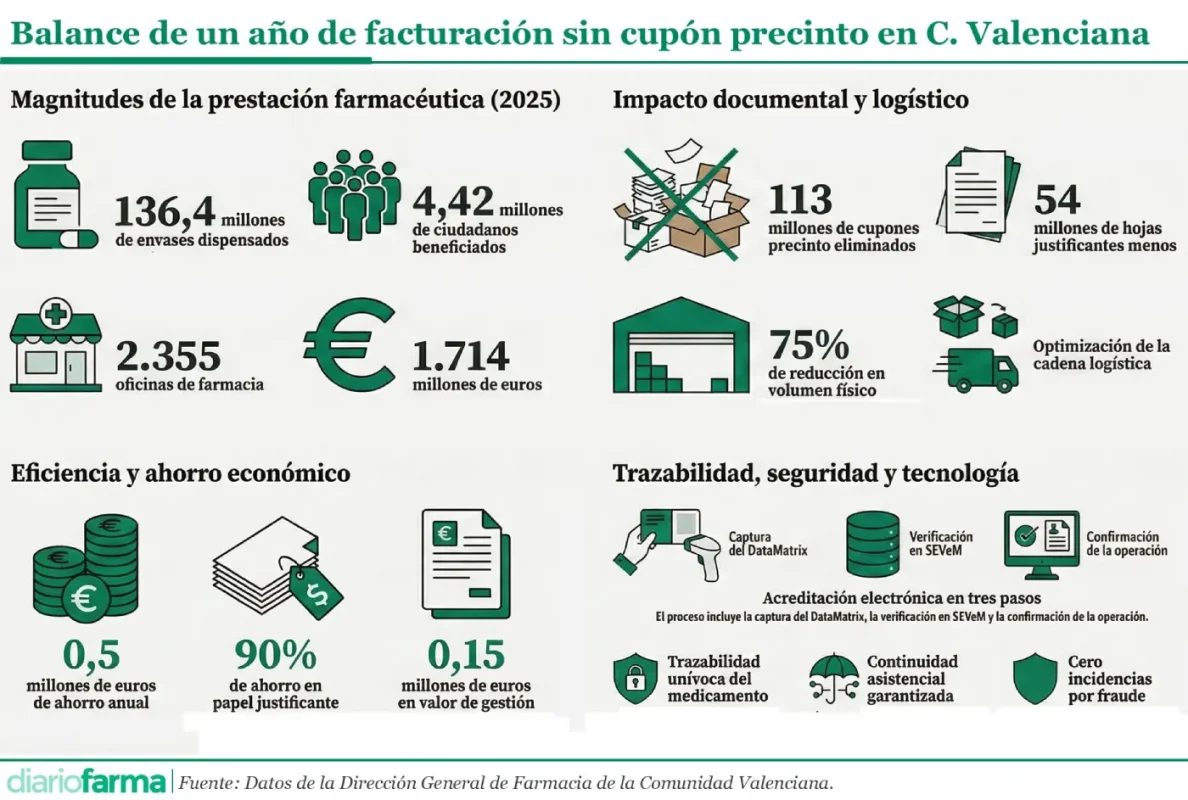 La Comunidad Valenciana ha cerrado su primer año completo sin recortar cupones precinto en las farmacias. En 2025, el sistema sanitario valenciano gestionó 136,4 millones de envases dispensados con financiación pública, por un importe aproximado de 1.714 millones de euros, a través de 2.355 oficinas de farmacia y con 4,42 millones de ciudadanos que recibieron al menos una dispensación. Todo ese volumen se tramitó sin soporte físico justificativo.