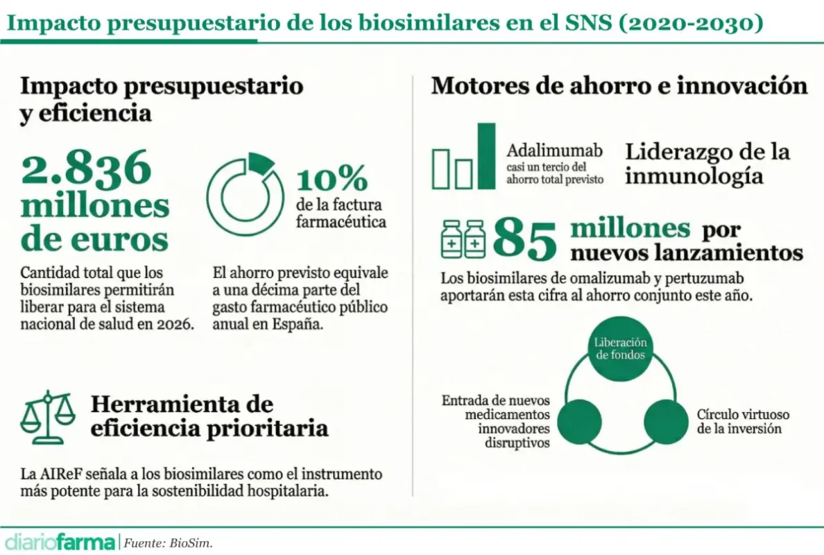 El Sistema Nacional de Salud se encuentra ante una oportunidad de eficiencia sin precedentes. Así lo señala el informe 'Análisis de impacto presupuestario de los medicamentos biosimilares en el Sistema Nacional de Salud de España (2020-2030)', el uso de estos fármacos permitirá liberar 2.836 millones de euros durante el ejercicio 2026. Esta cuantía representa aproximadamente el 10% del gasto farmacéutico público anual y constituye una herramienta estratégica para la sostenibilidad del modelo sanitario.