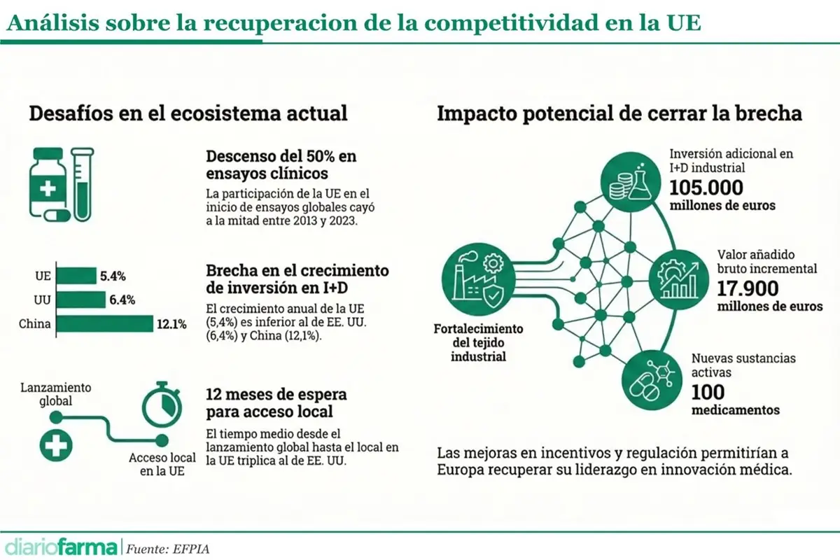El análisis cuantifica los beneficios potenciales de cerrar la brecha con sus competidores más cercanos. Solo la equiparación en inversión industrial en I+D generaría 105.000 millones de euros adicionales en la próxima década. Por otro lado, recuperar la cuota de mercado en ensayos clínicos aportaría cerca de 18.000 millones de euros a la economía europea, permitiría la creación de 82.000 puestos de trabajo y facilitaría que 158.000 pacientes adicionales participaran en estudios de nuevos fármacos.