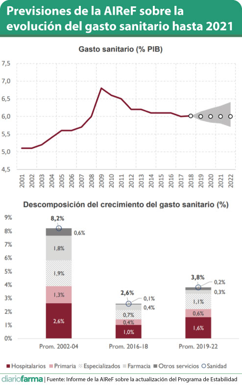 El documento presentado ahora por este organismo recoge las previsiones de la APE en lo que respecta al gasto sanitario en relación con el PIB. Ésta estima un crecimiento promedio del 3,7%, del cual, sólo un 0,3% vendría por Farmacia, si bien la Airef estima que el aumento podría estar más cerca del 4%. Recuerda, a este respecto, que el Gobierno reconoce "una presión al alza asociada a la reforma del sistema de financiación de las administraciones territoriales". Desde el organismo indican también "el principal elemento de presión sobre el gasto (sanitario) es el gasto hospitalario, debido a las presiones existentes en la remuneración y los consumos intermedios, que registran, entre otros conceptos, el gasto en farmacia hospitalaria".